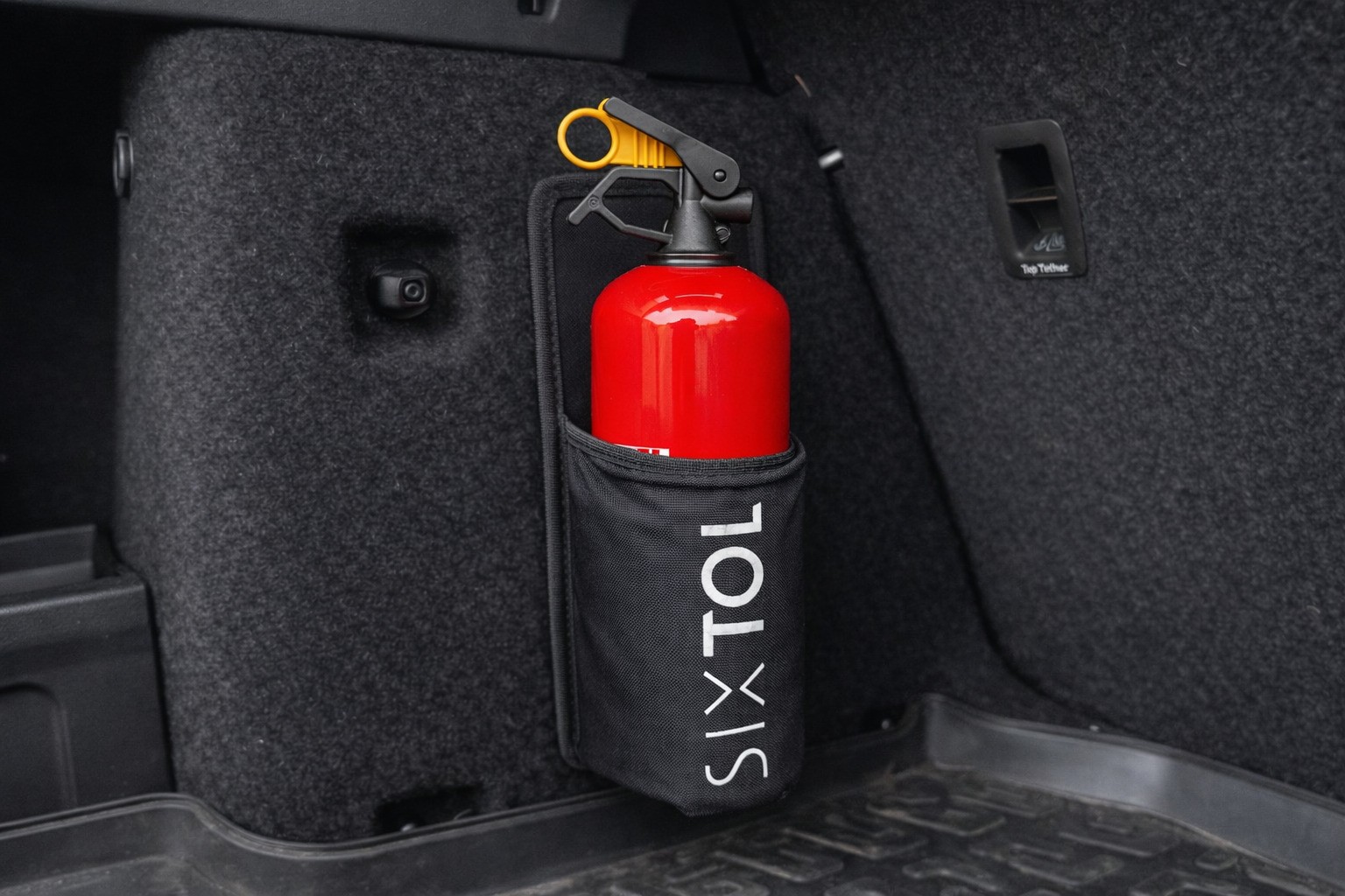Použití:- Uchycení hasicího přístroje na bok kufru