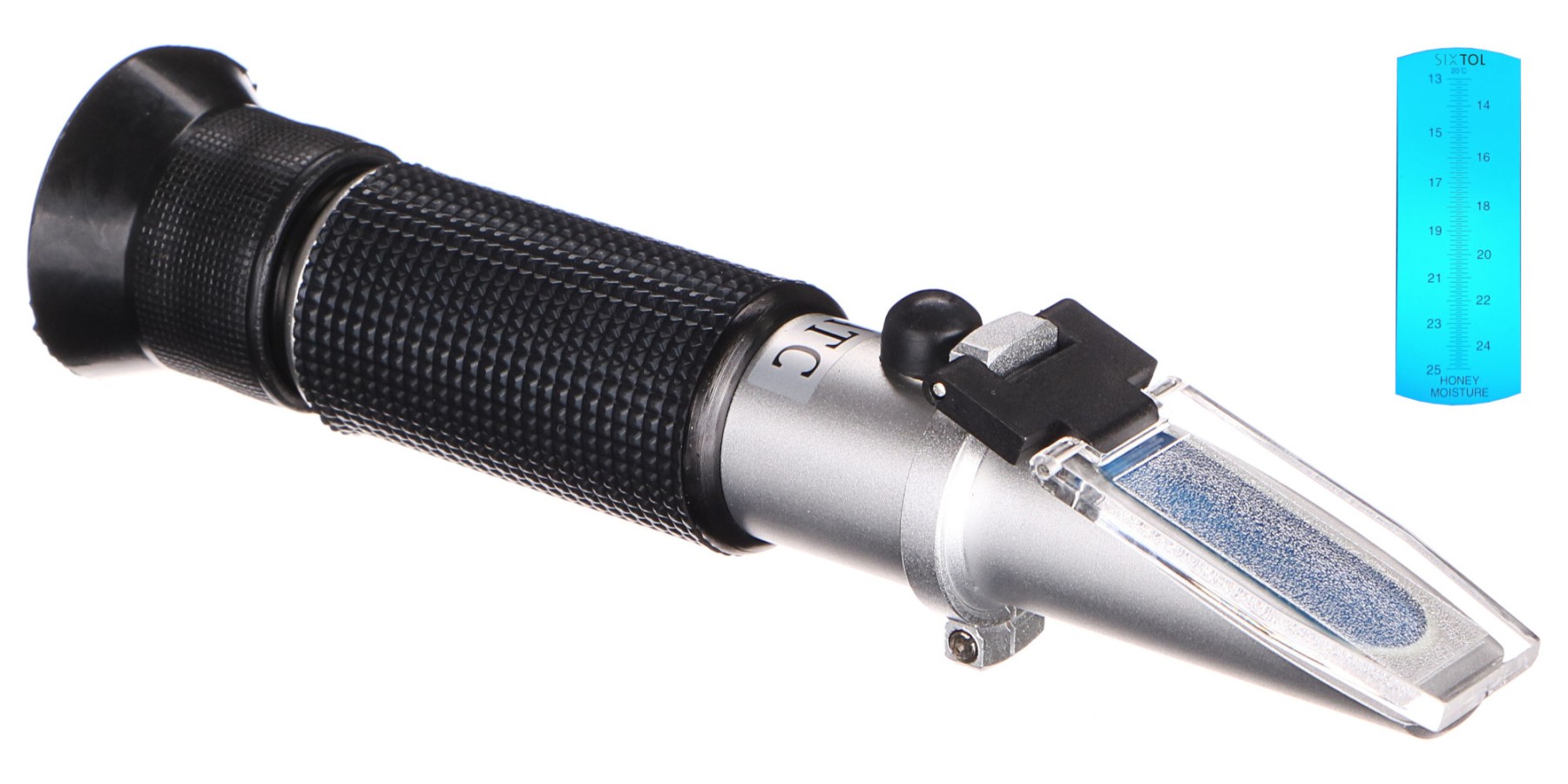 Způsob měření:- Měření refraktometrem na med je velmi jednoduché, stačí kápnout kapku medu na zešikmený optický hranol přístroje, přiklopit krytku hranolu (med se rozprostře), podívat se proti světlu do okuláru přístroje, případně ho zaostřit a na stupnici. V zorném poli lze ihned odečíst hodnotu obsahu vody v medu podle rozhraní mezi osvětlenou a neosvětlenou částí.