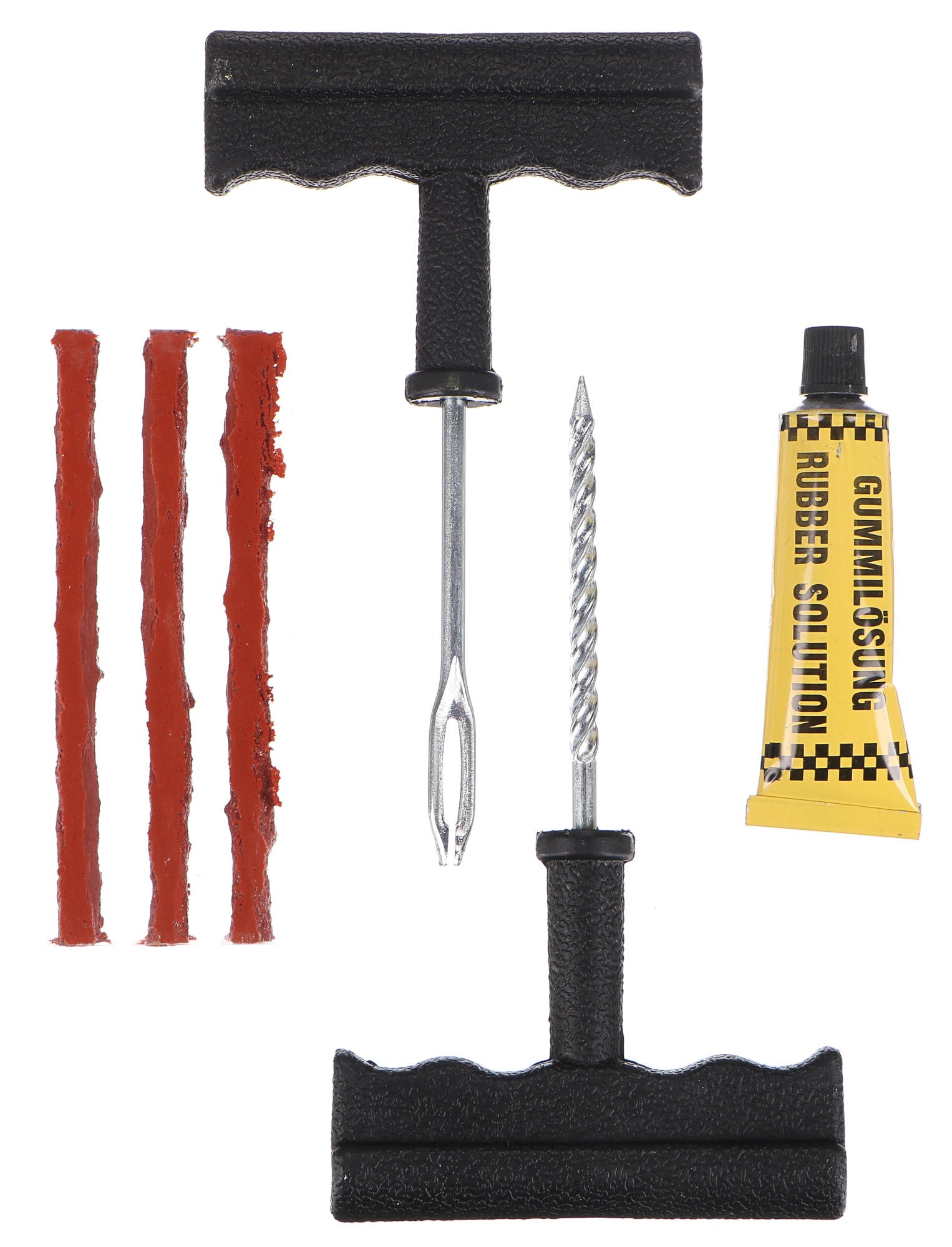Inovativní sada na opravu defektu pneumatiky CAR TIRE REPAIR SET 1 je nezbytným pomocníkem každého řidiče. Umožní vám snadno a rychle vyřešit nečekaný defekt bez nutnosti navštívit servis bez ohledu na to, zda jste na dlouhé cestě, v práci nebo doma.Návod k použití: Najděte místo, kde je pneumatika propíchnutá, případně odstraňte předmět, který způsobil defekt. Do otvoru zasuňte průtažník a následně ho protahujte směrem nahoru a dolu - do doby než bude snadno procházet otvorem - tímto je otvor vyčištěn a připraven. Knot zbavený ochranné fólie provlékněte otvorem vidlice a naneste na něj vulkanizační roztok. Zastrčte vidlici s nasazeným knotem do otvoru tak, aby jeho polovina zůstala z vnější strany pneu, poté otočte vidlicí a pomalu ji vytáhněte. Odřízněte zbytek knotu co nejblíže k pneumatice.