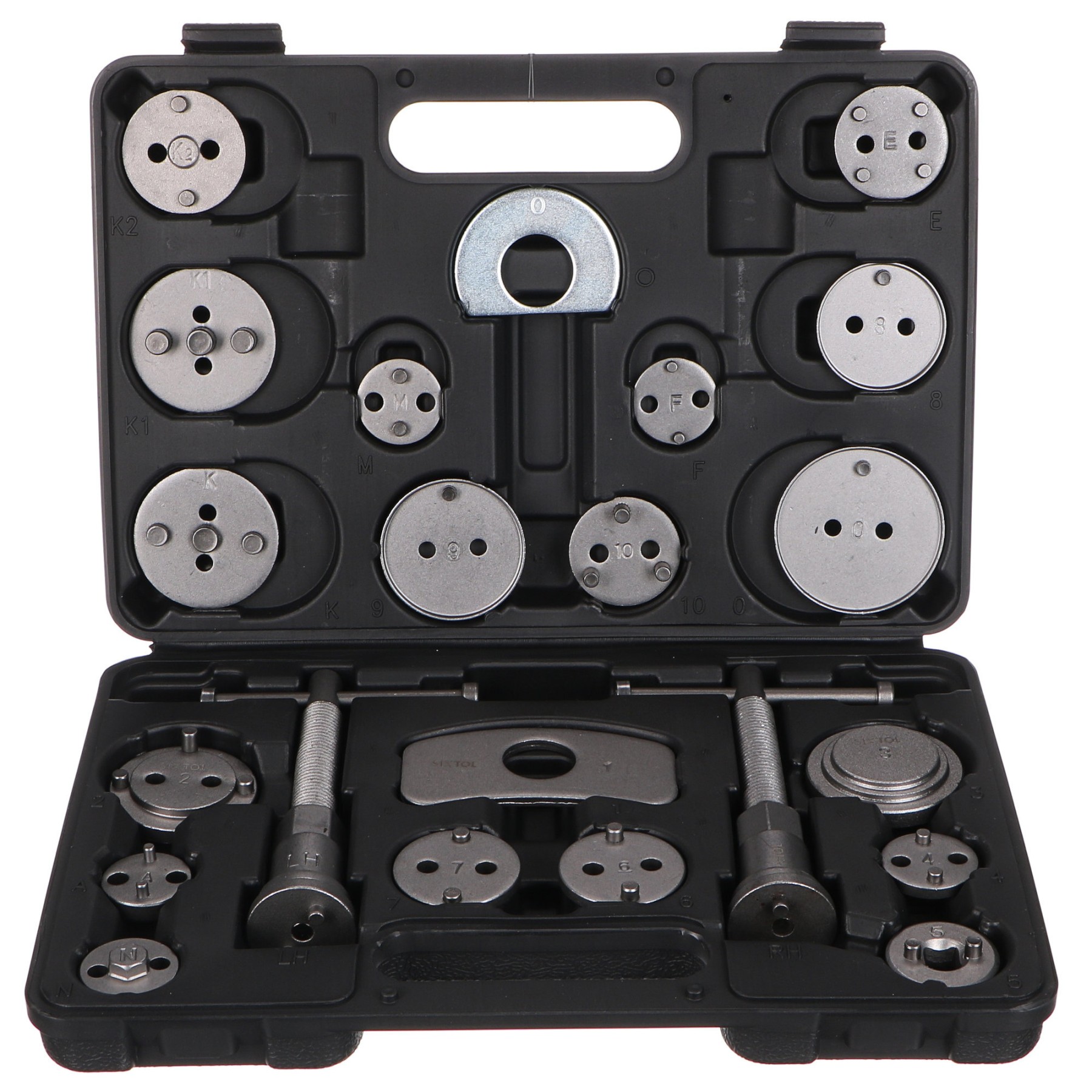 pravotočivou i levotočivou stlačovací závitnici s magnetem, dva dorazy a 18 různých adaptérů. U vozidel s třmeny kotoučových brzd a s integrovanou jednotkou ruční brzdy se zpětné vracení brzdových pístů provádí zpětným otáčením, u ostatních vozidel zpětným stlačením těchto pístů.