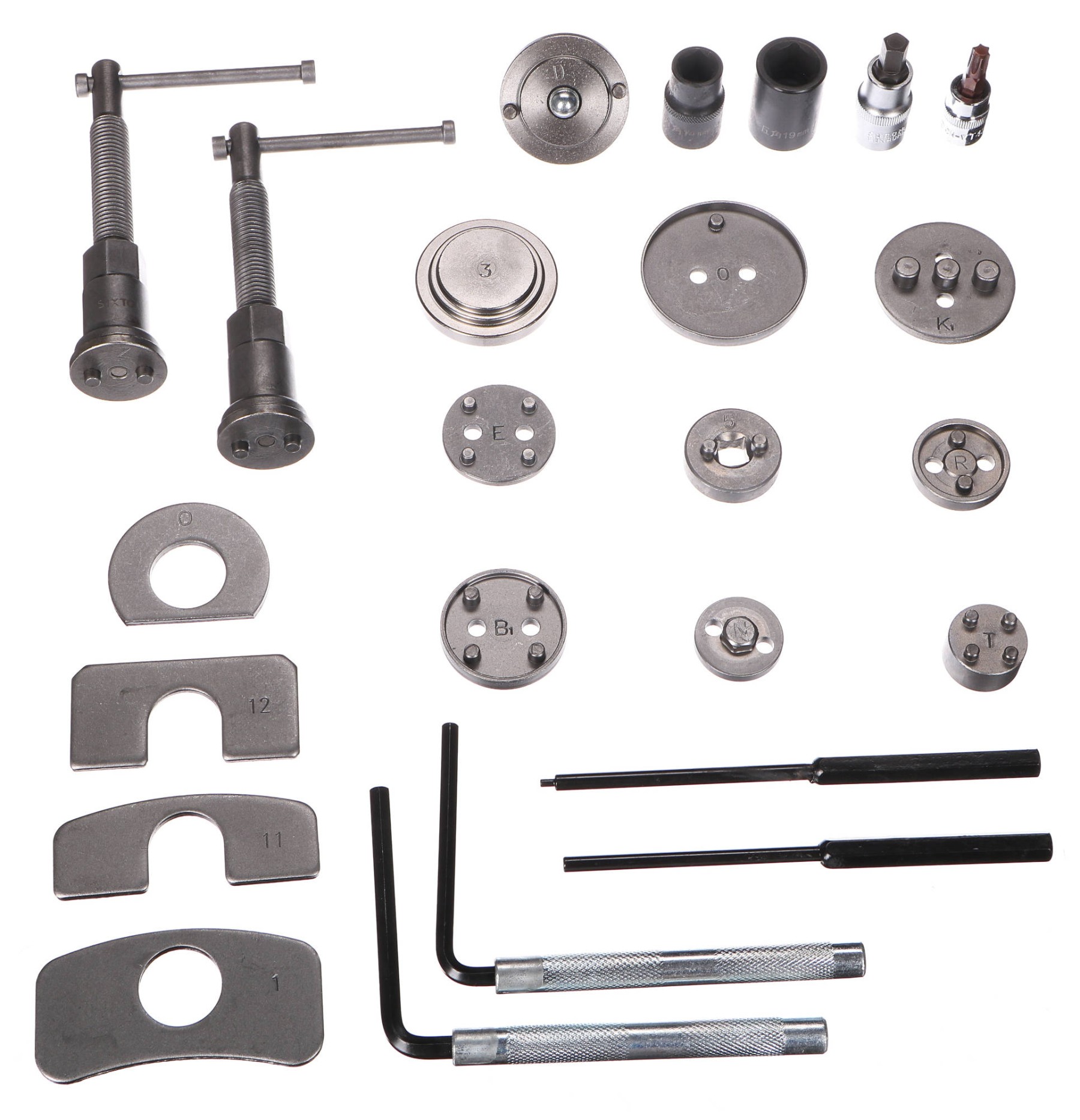obsahuje pravotočivou i levotočivou stlačovací závitnici s magnetem, čtyři dorazy, dva imbusové klíče, úderníky, nádobku na mazivo a množství různých adaptérů. U vozidel s třmeny kotoučových brzd a s integrovanou jednotkou ruční brzdy se zpětné vracení brzdových pístů provádí zpětným otáčením, u ostatních vozidel zpětným stlačením těchto pístů.